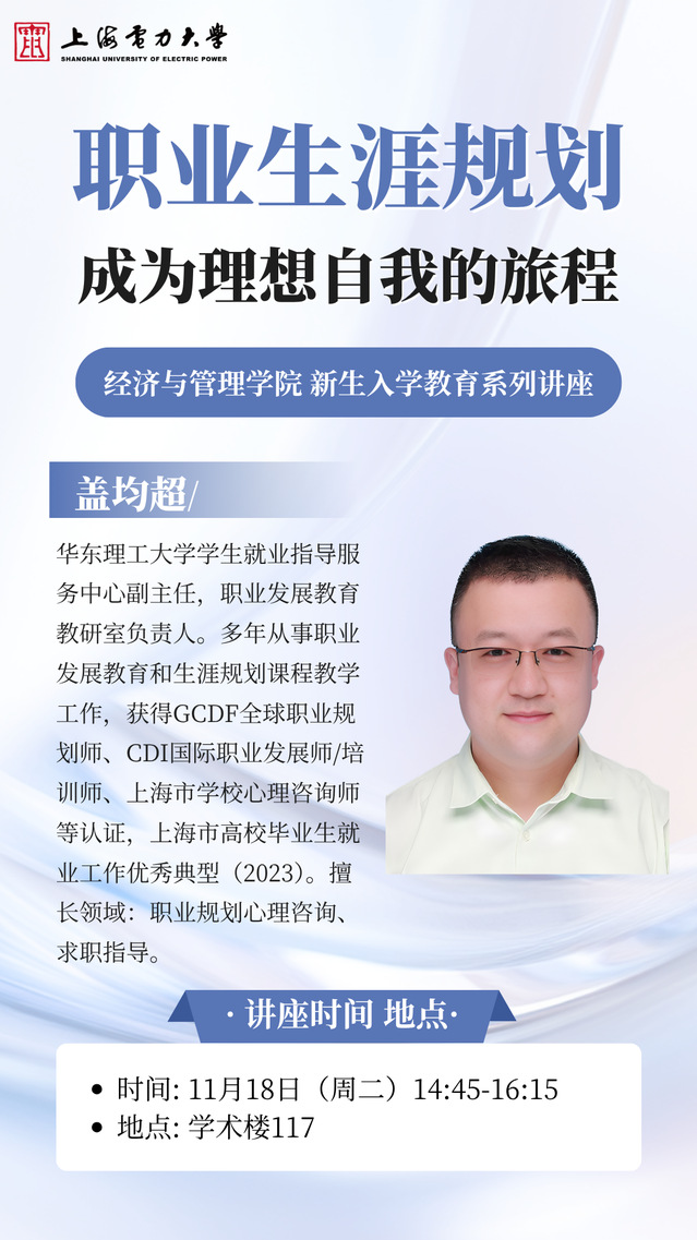 为引导新生树立科学的职业发展观念,提升生涯规划意识。11月18日,亚博取款心丈秒到账开展入学教育——职业生涯规划专题讲座。本次活动特邀华东理工大学学生就业指导服务中心副主任、职业发展教育教研室负责人盖钧超担任主讲人,以“职业生涯规划——成为理想自我的旅程”为主题,通过系统阐释五大核心理论,为同学们构建科学的生涯规划认知体系,从提升认知到付诸实践,全方位明确大学发展路径与职业探索方向。